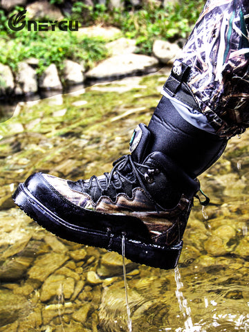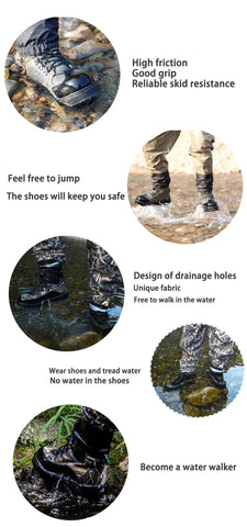 The boots fabric adopt reliable hydrophobic material, add the draining hole at the bottom of the boots. Promise user move convenient in water and up bank.